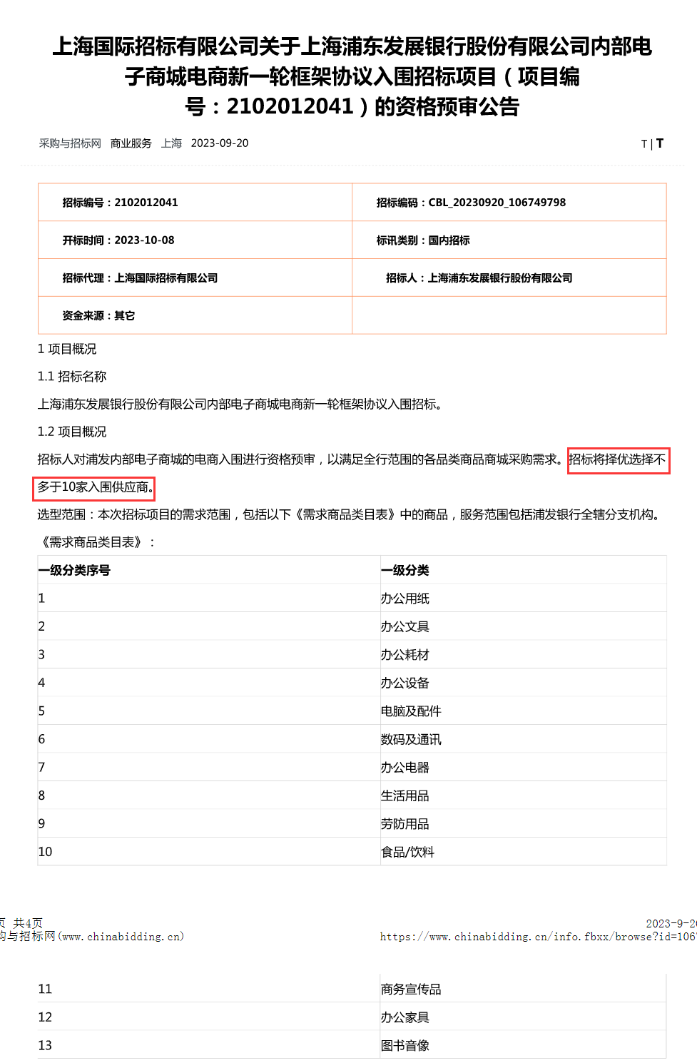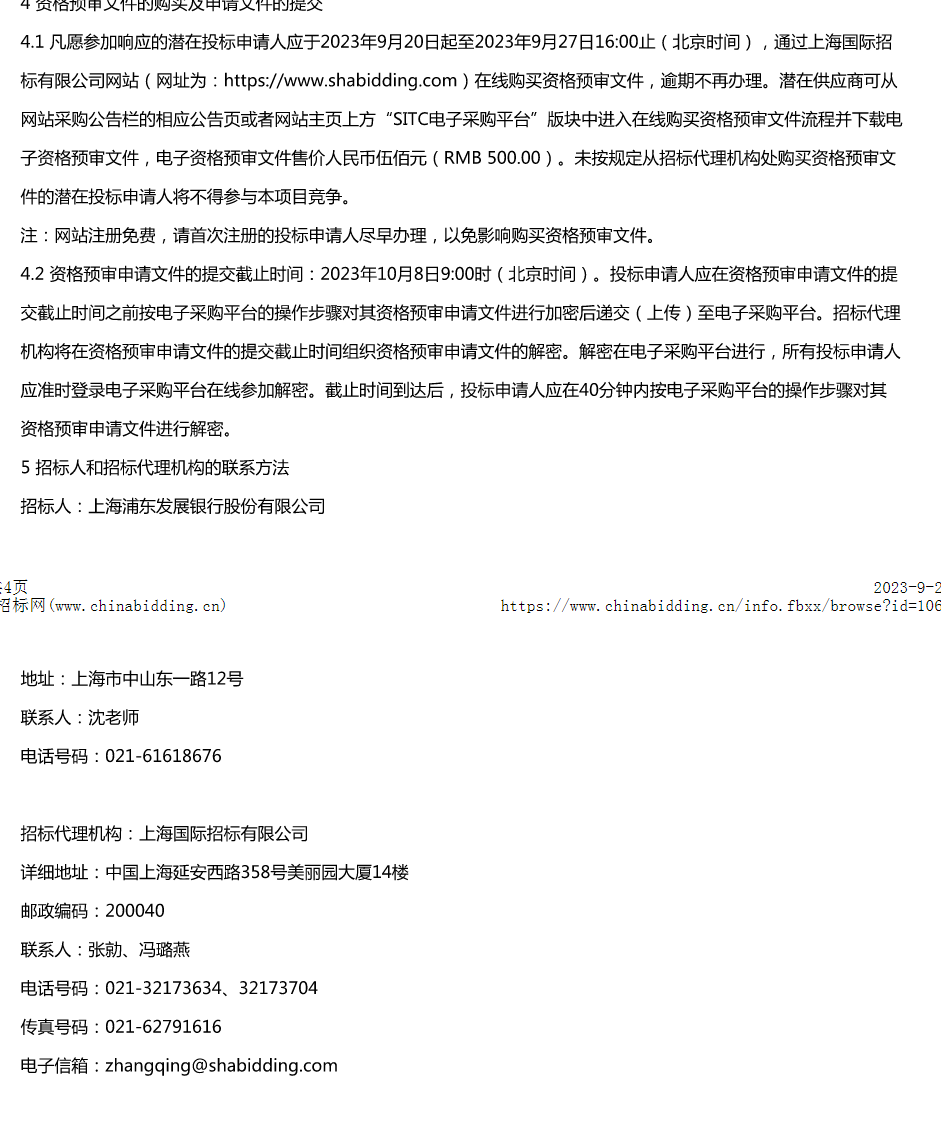上海浦东发展银行股份有限公司内部电子商城电商新一轮框架协议入围招标项目资格预审公告