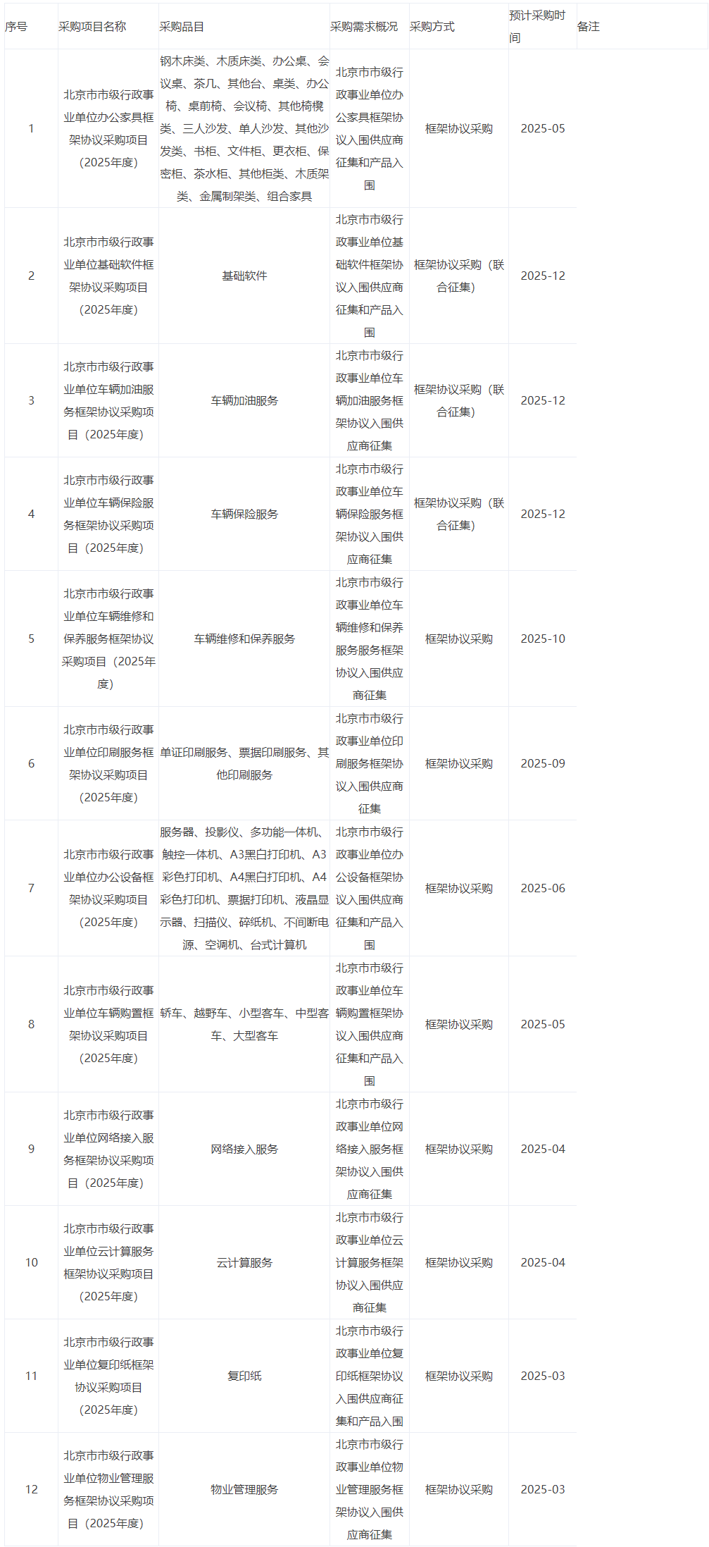 为便于供应商及时了解政府采购信息,根据《财政部关于开展政府采购意向公开工作的通知》(财库[2020]10号)等有关规定, 现将北京市公共资源交易中心(北京市政府采购中心) 2025 年2 (至)12 月北京市协议采购项目采购意向公开如下:
